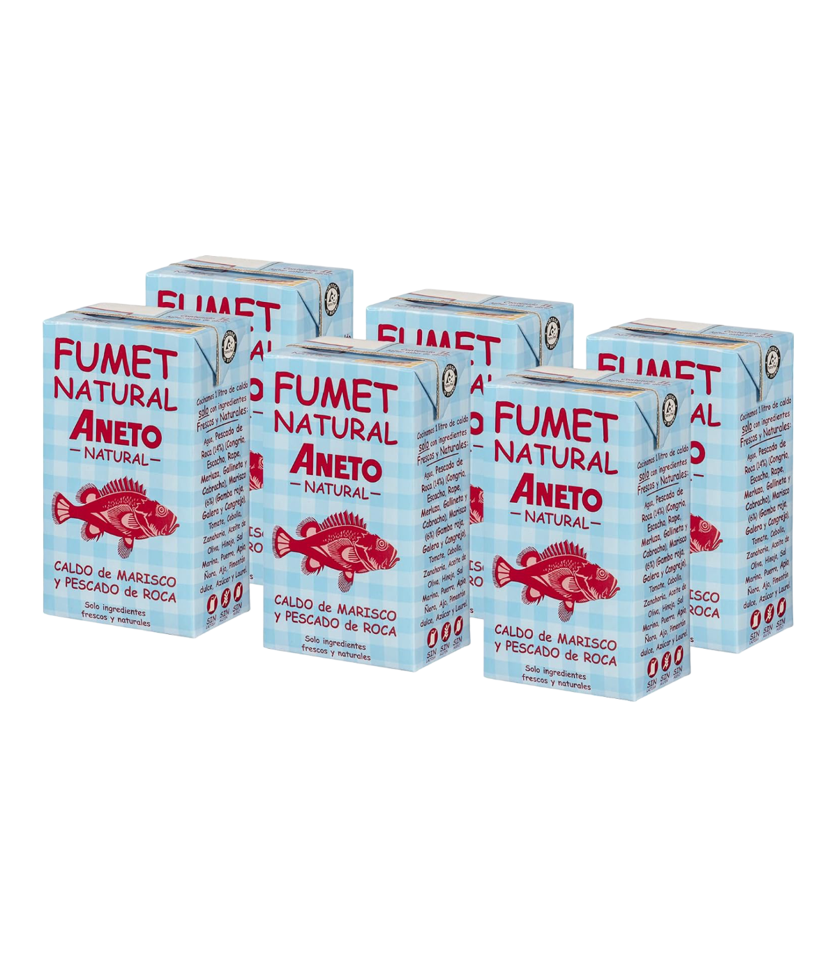 Agua, marisco* (15%: Galeras*, Gambas*, Mejillones*, Buey de mar*), cebolla, Rape*, tomate, zanahoria, Bacalao*, ajo, sal marina, aceite de oliva virgen extra, hinojo, harina de maíz, puerro, apio*,...