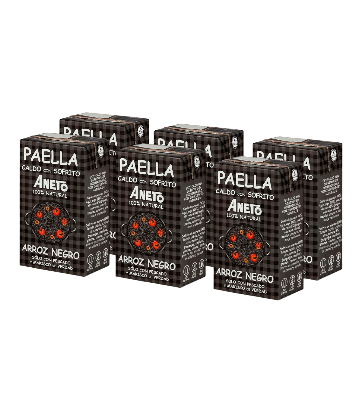 Caldo de pescado* (86%): agua, rape* (12%), pescado de roca* (6%: congrio*, cabracho*, cintas*), bacalao*, zanahoria, apio*, hinojo y sal marina.